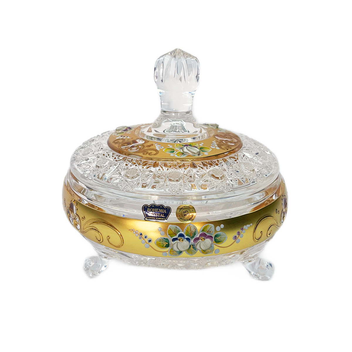 Item: Bohemia Crystal Bonbonniere with Cover and Legs -Hand Cut -16.5 cm -Gold