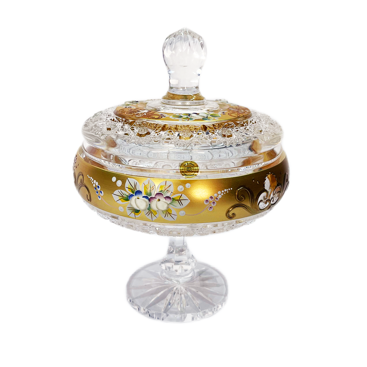 Item: Bohemia Crystal Bonbonniere with Cover and Base -Hand Cut -16.5 cm -Gold