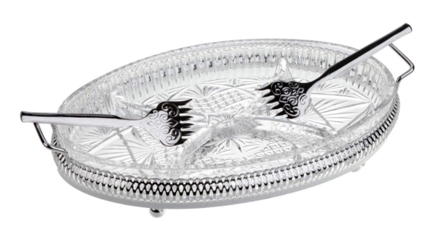Item: Hors d'oeuvre 4 Division Oval Patterned with 2 Serving Forks -30.8x20cm -Silver Plated & Glass