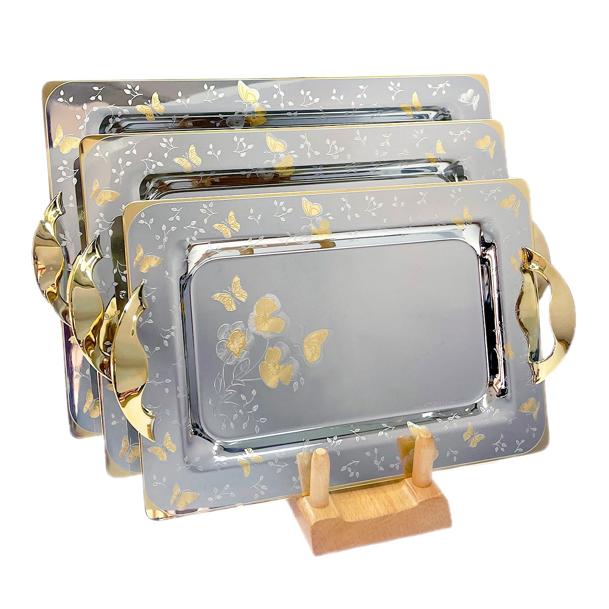 Tresors Rectangular Tray with Handles, 3 Pieces -Made in Italy -Silver & Gold -Stainless Steel 18/10