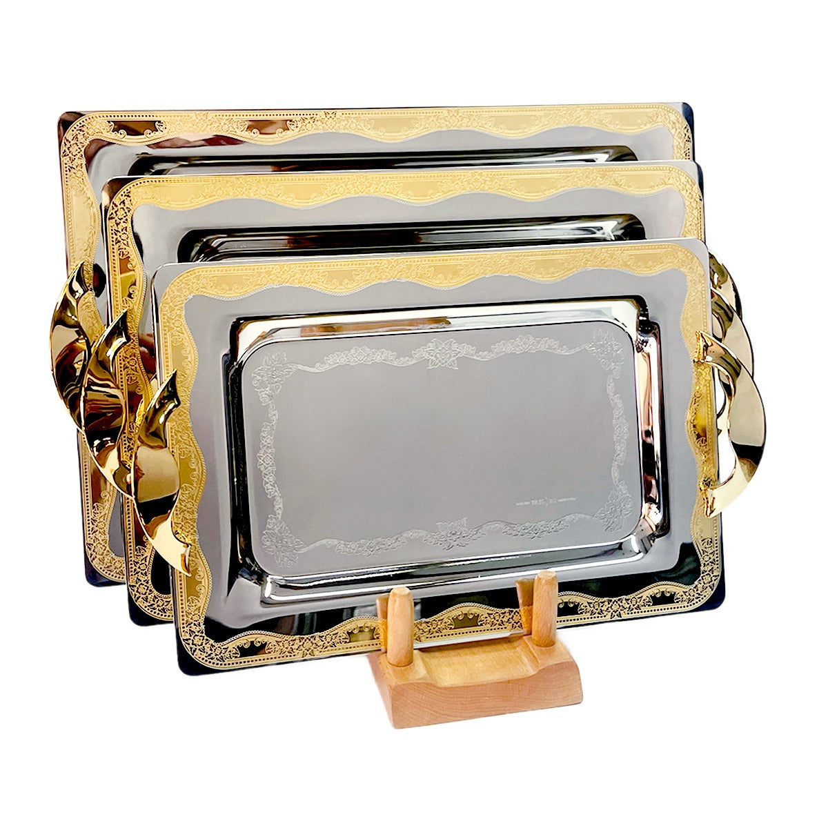 Tresors Rectangular Tray with Handles, 3 Pieces -Made in Italy -Silver & Gold -Stainless Steel 18/10