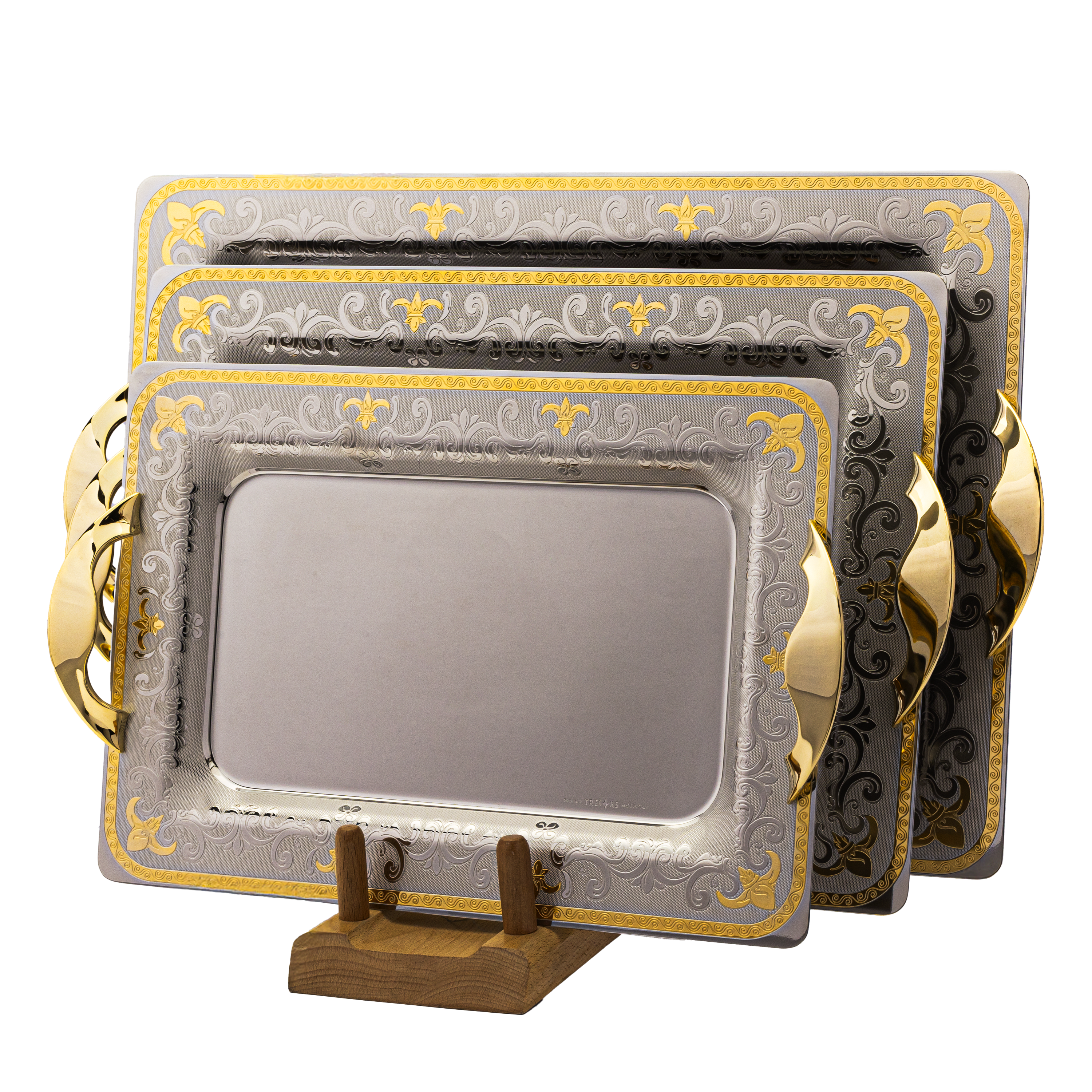 Item: Tresors Rectangular Tray with Handles, 3 Pieces -Made in Italy -Silver & Gold -Stainless Steel 18/10